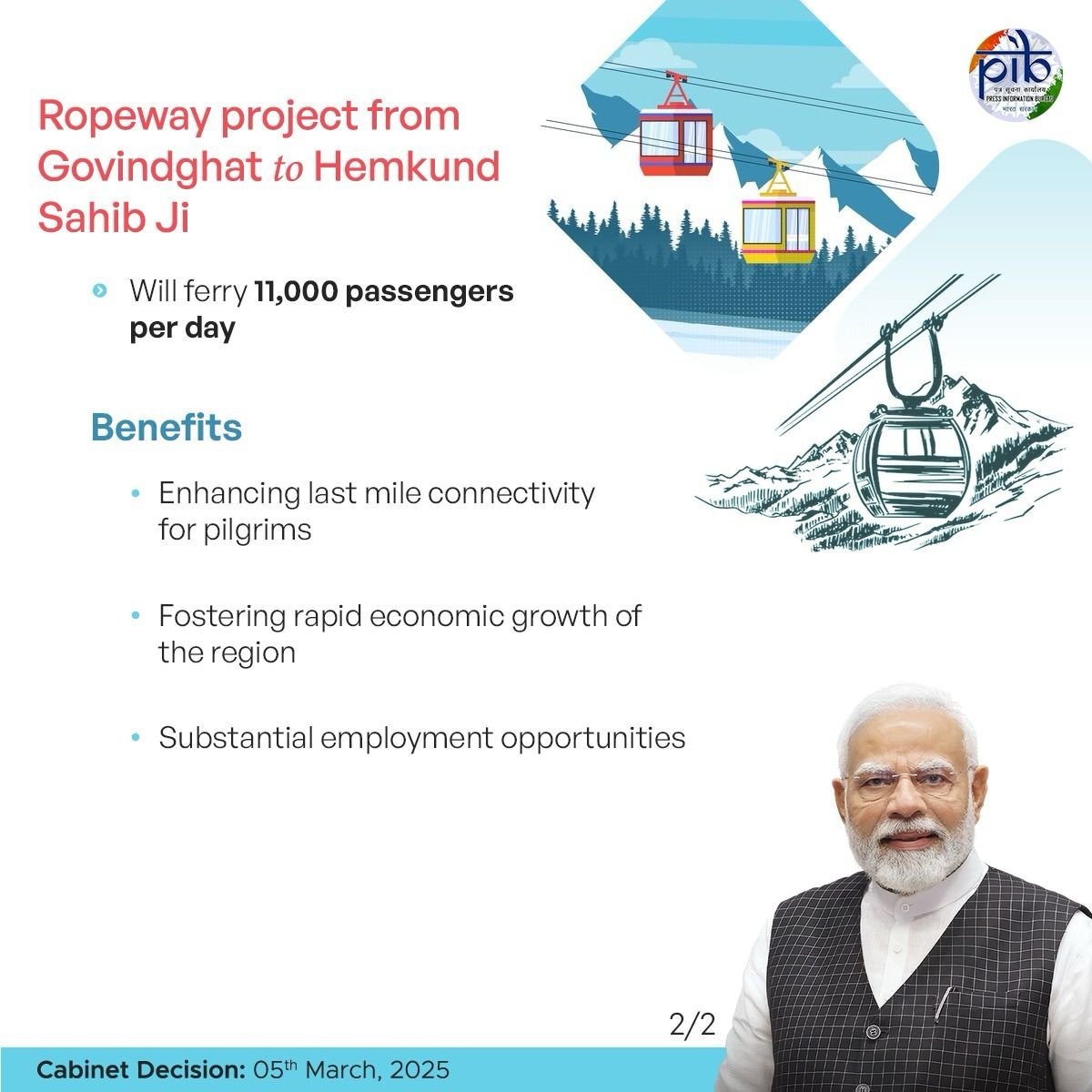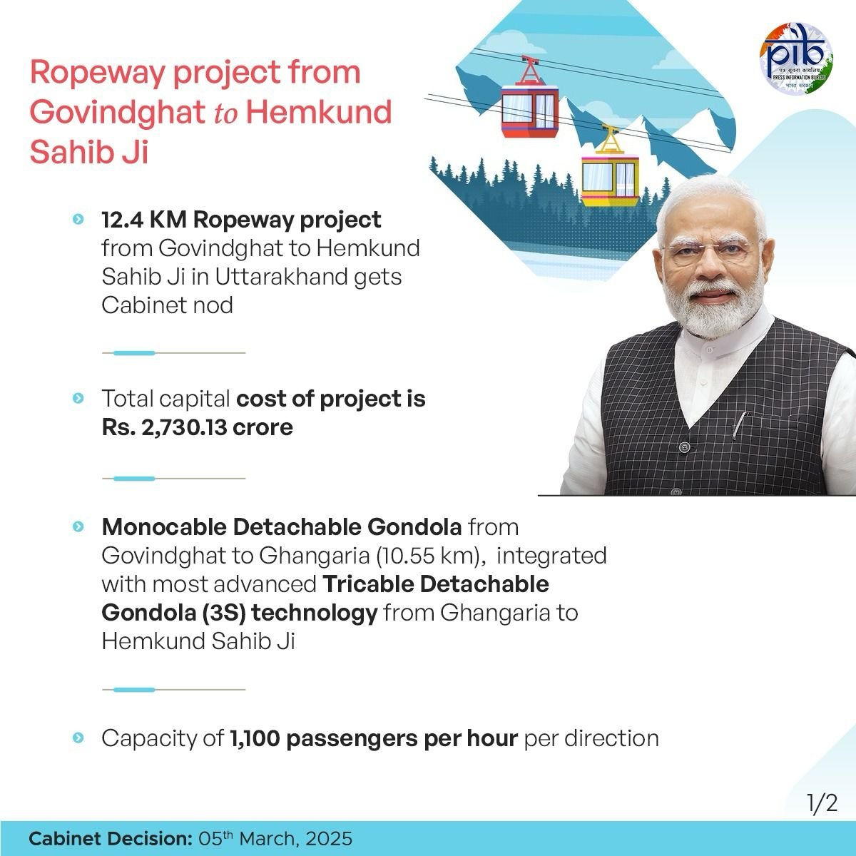 कैबिनेट ने राष्ट्रीय रोपवे विकास कार्यक्रम – पर्वतमाला परियोजना के तहत उत्तराखंड राज्य में गोविंदघाट से हेमकुंड साहिब जी (12.4 किमी) तक रोपवे परियोजना के विकास को दी मंजूरी