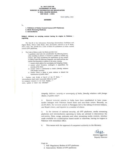 • सभी ओटीटी प्लेटफॉर्म्स को पाकिस्तान मूल के वेब सीरीज़, फिल्में, गाने, पॉडकास्ट और अन्य डिजिटल कंटेंट को हटाने का आदेश दिया गया है, चाहे वह मुफ्त हो या सब्सक्रिप्शन मॉडल पर।