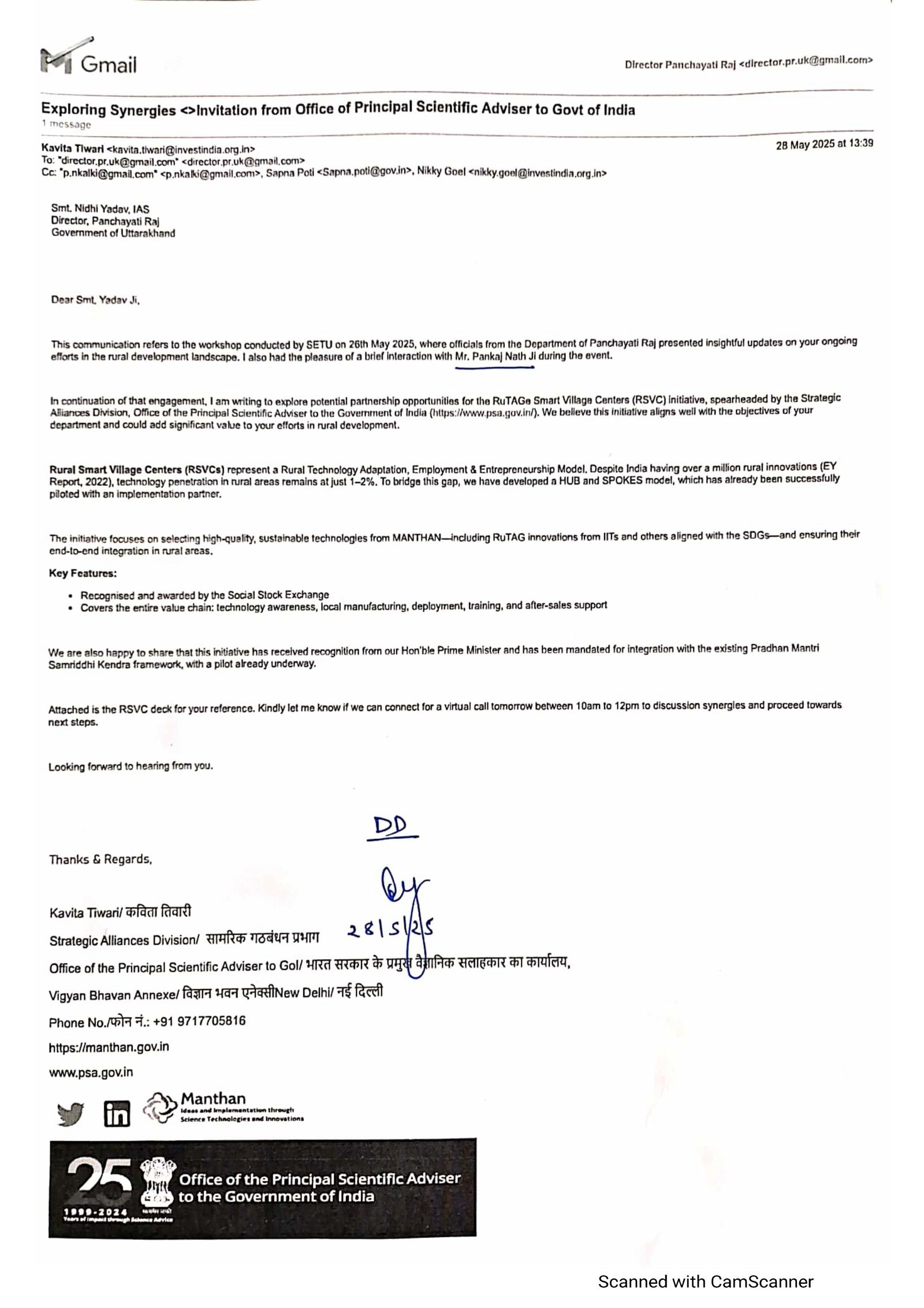 इस प्रस्तुतीकरण के बाद, तीन दिवसीय कार्यशाला का मुख्य विषय “स्मार्ट विलेज सेंटर” की जगह पंचायती राज विभाग द्वारा प्रस्तुत की गई कार्ययोजना बन गया। इस सफलता के बाद, नई दिल्ली से प्रिंसिपल साइंटिफिक एडवाइजर ऑफ इंडिया के निदेशक ने पंचायती राज निदेशक निधि यादव से प्रदेश में साथ काम करने का प्रस्ताव दिया।
