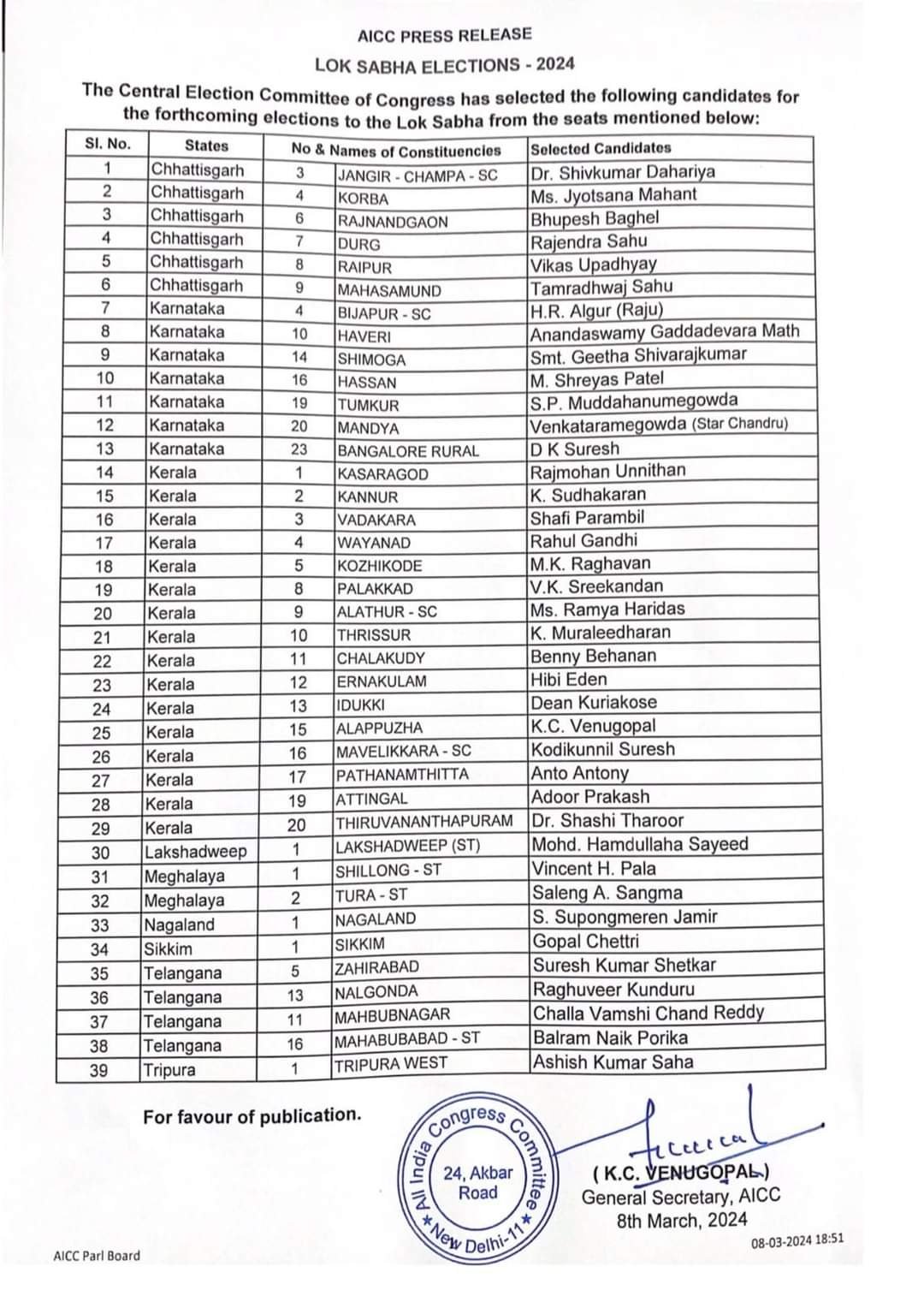 लोकसभा चुनाव 2024 : कांग्रेस की पहली लिस्ट जारी, उम्मीदवारों के नाम किये घोषित …..