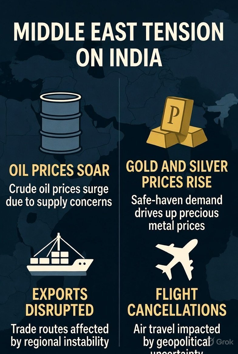 Home » Blog » मिडिल ईस्ट तनाव से भारत पर गहरा असर : तेल आपूर्ति खतरे में, सोना-चांदी में उछाल, एक्सपोर्ट और उड़ानें प्रभावित