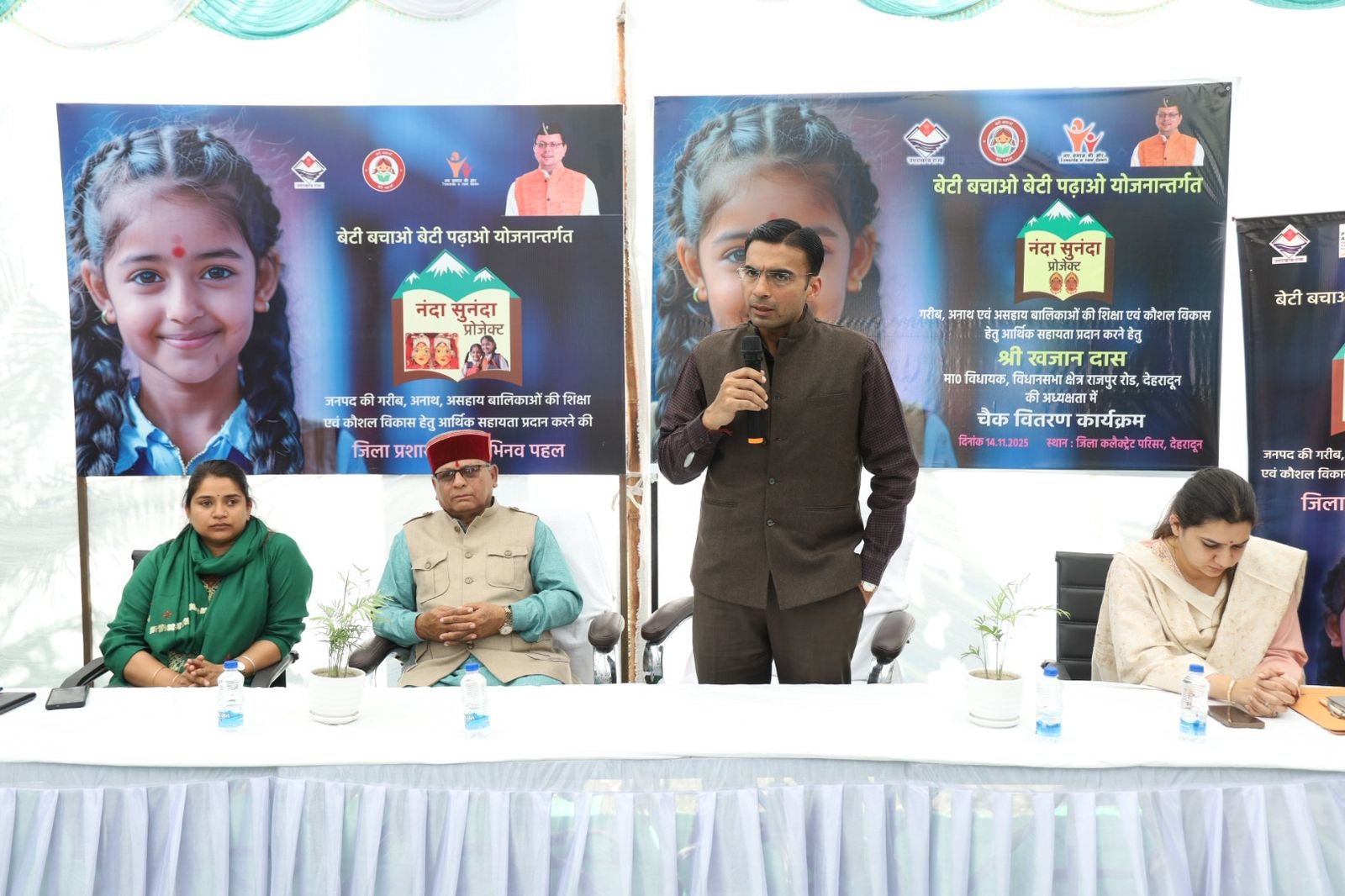 देहरादून : जिला कार्यालय परिसर देहरादून में आज प्रोजेक्ट नंदा सुनंदा के 10वें संस्करण का आयोजन में मुख्य अतिथि विधायक राजपुर खजान दास एवं जिलाधिकारी सविन बंसल ने गरीब, अनाथ और असहाय बालिकाओं को स्नातक, स्नातकोत्तर और कौशल शिक्षा में आत्मनिर्भर बनाने के लिए यह सहायता धनराशि का चेक प्रदान किया। आज 32 बालिकाओं को 13 लाख धनराशि के चेक वितरित किए गए।