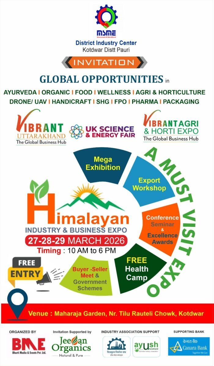 पौड़ी : कोटद्वार शहर में पहली बार हिमालयन इंडस्ट्री एंड बिजनेस एक्सपो का आयोजन 27 से 29 मार्च तक महाराजा गार्डन, तीलू रौतेली चौक के निकट किया जाएगा। कार्यक्रम का आयोजन जिला उद्योग केंद्र कोटद्वा द्वारा कराया जा रहा है।