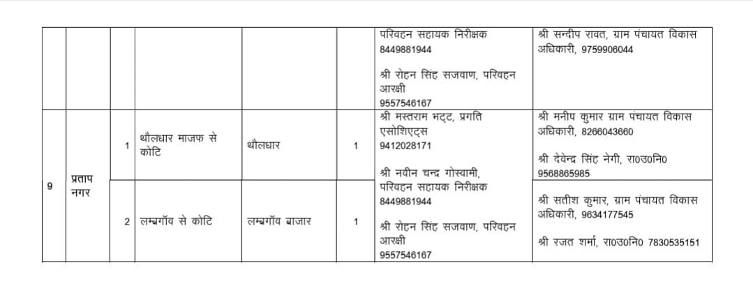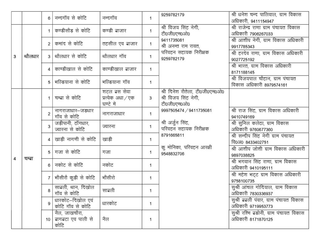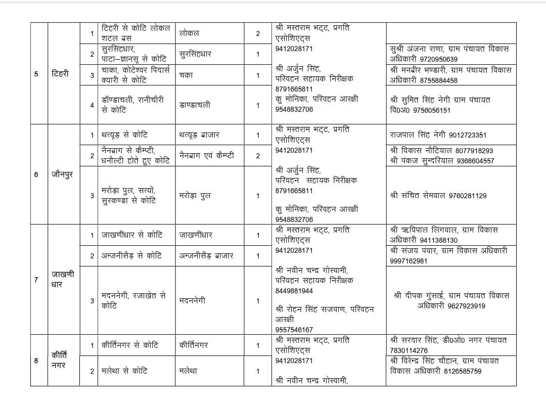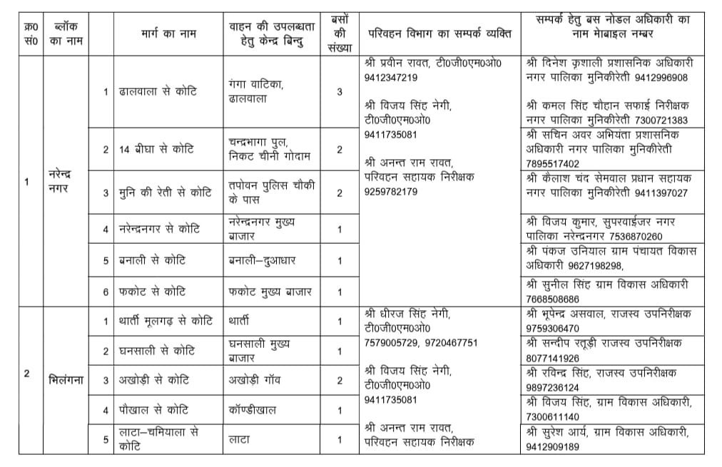 जारी रूट चार्ट के अनुसार नरेंद्रनगर, भिलंगना, थौलधार-चंबा, जौनपुर, जाखणीधार, कीर्तिनगर, प्रतापनगर विकासखंडों सहित जिला मुख्यालय से संबंधित मार्गों को शामिल किया गया है।